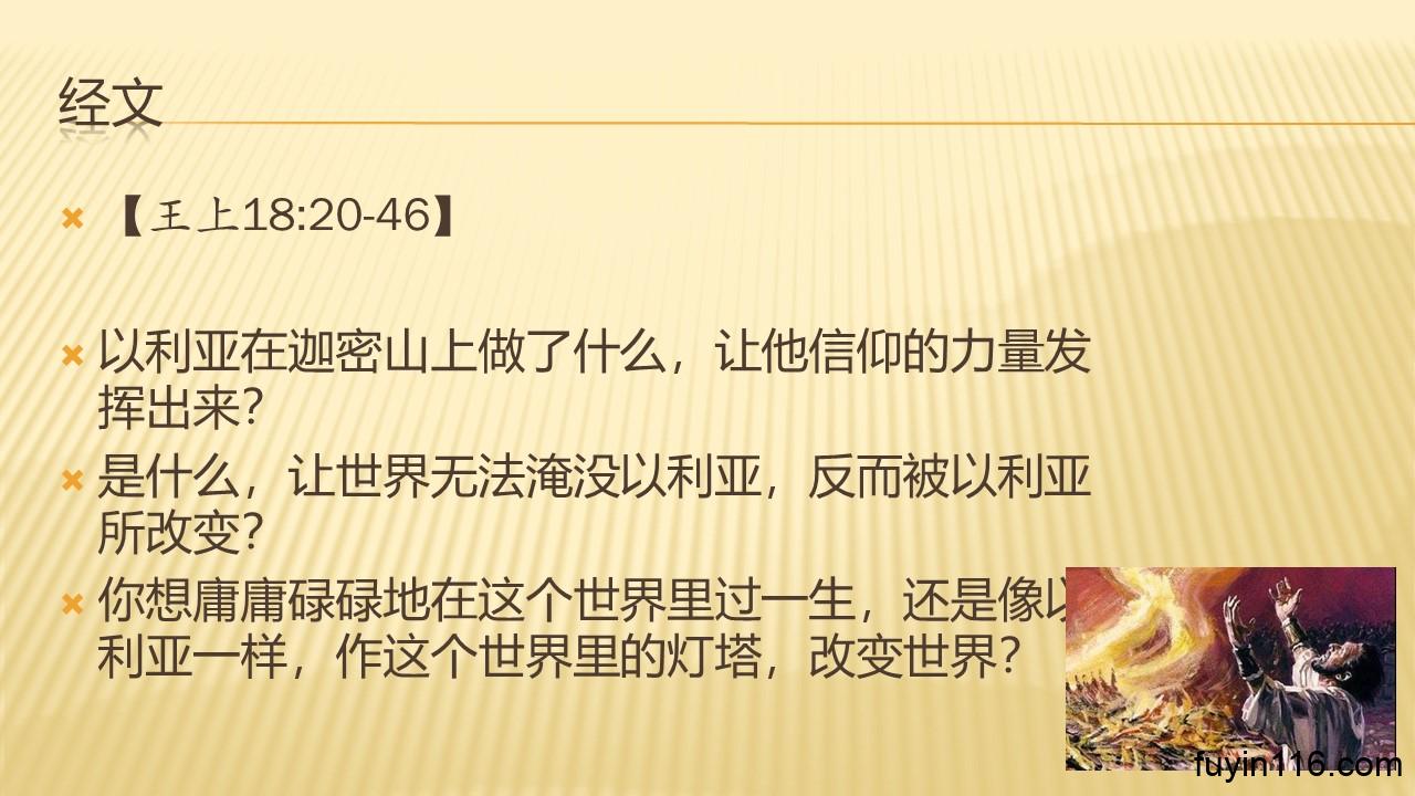 愿感动以利亚的灵,加倍地感动每一个愿意效法以利亚而行的心灵!