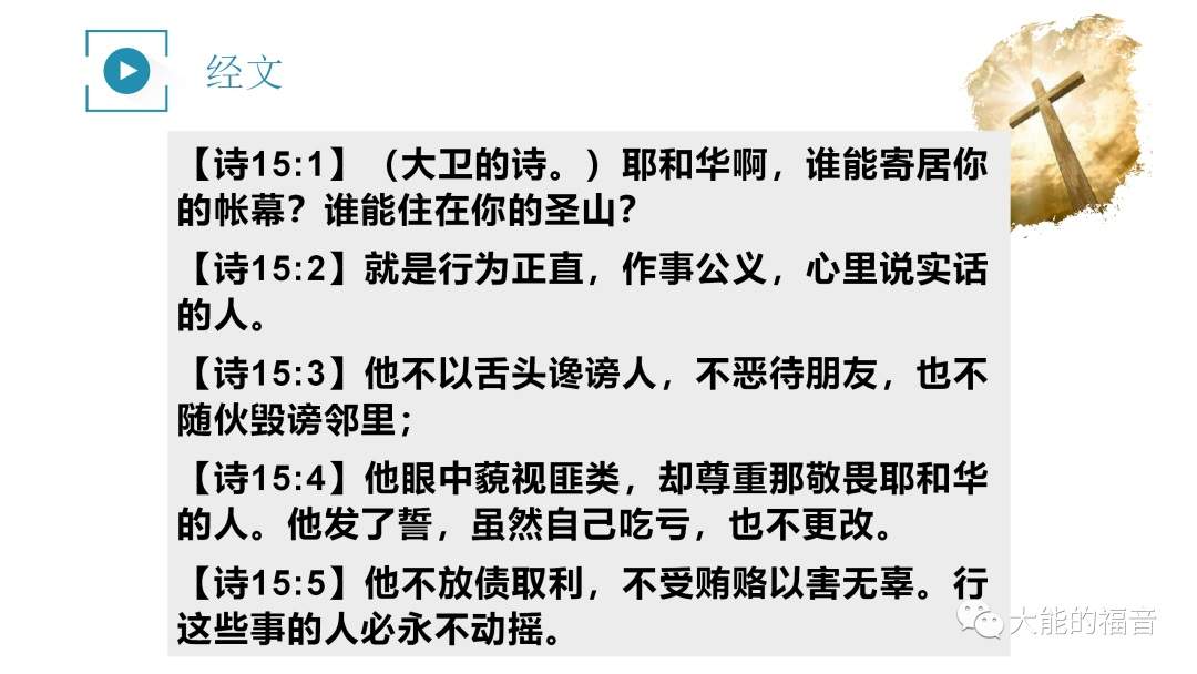 【诗15:1】(大卫的诗。)耶和华啊,谁能寄居你的帐幕?谁能住在你的圣山?