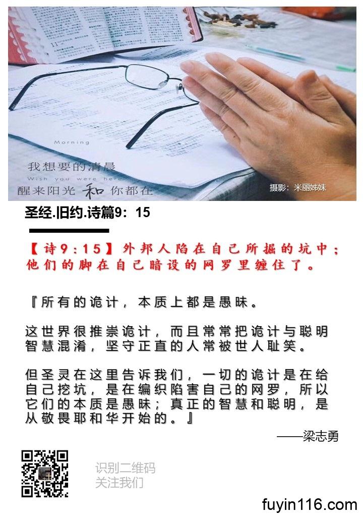 【诗9:15】外邦人陷在自己所掘的坑中;他们的脚在自己暗设的网罗里缠住了。