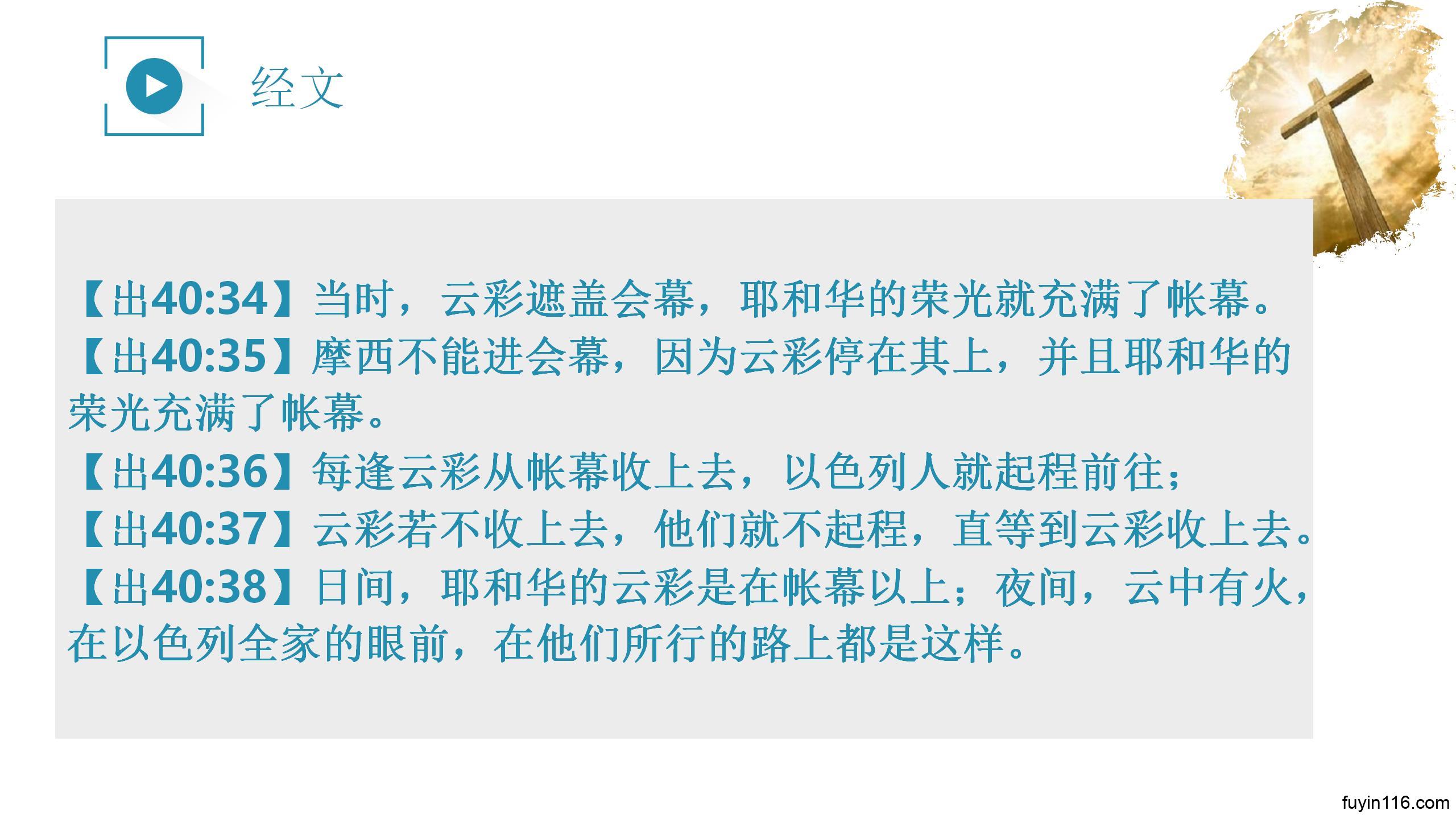 【出40:37】云彩若不收上去,他们就不起程,直等到云彩收上去。