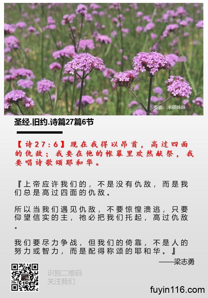 【诗27:6】现在我得以昂首,高过四面的仇敌;我要在他的帐幕里欢然献祭,我要唱诗歌颂耶和华。 《不是没有仇敌,而是高过仇敌》 作者:梁志勇牧师 朗诵:徐辉姊妹 【诗27:6】现在我得以昂首,高过四面的仇敌;我要在他的帐幕里欢然献祭,我要唱诗歌颂耶和华。 『上帝应许我们的,不是没有仇敌,而是我们总是高过四面的仇敌。 所以,当我们遇见仇敌,不要惊惶溃逃,只要仰望信实的主,祂必把我们托起,高过仇敌。 我们要尽力争战,但我们的倚靠,不是人的努力或智力,而是配得称颂的耶和华。』 主耶稣基督,感谢赞美你 感谢你把…