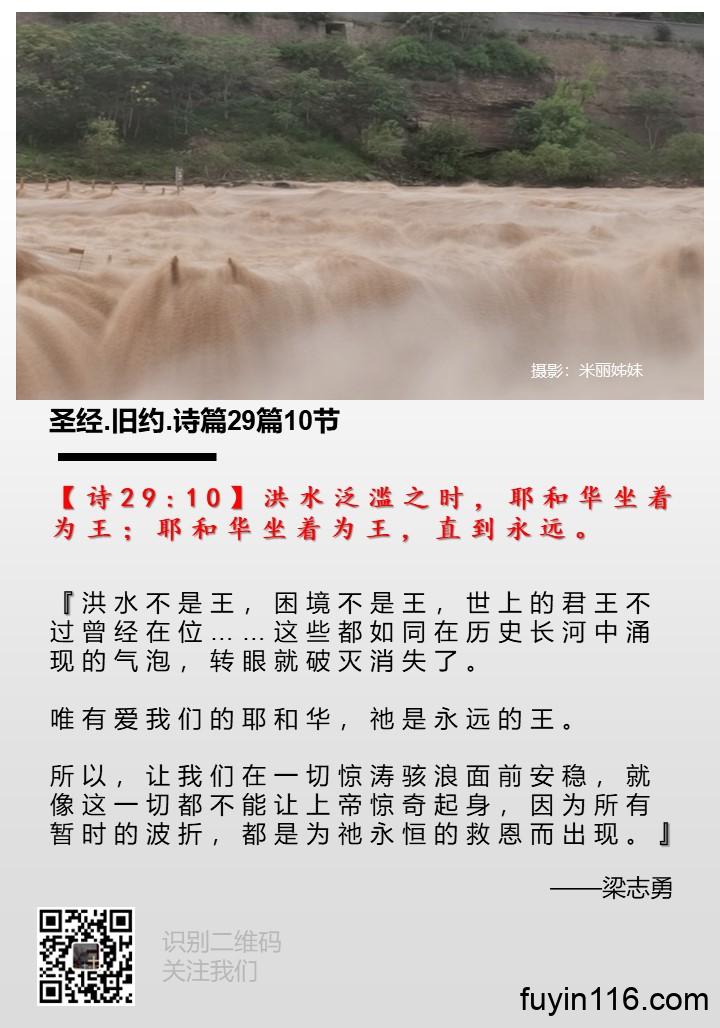 【诗29:10】洪水泛滥之时,耶和华坐着为王;耶和华坐着为王,直到永远。 【诗29:10】洪水泛滥之时,耶和华坐着为王;耶和华坐着为王,直到永远。 『洪水不是王,困境不是王,世上的君王不过曾经在位……这些都如同在历史长河中涌现的气泡,转眼就破灭消失了。 唯有爱我们的耶和华,祂是永远的王。 所以,让我们在一切惊涛骇浪面前安稳,就像这一切都不能让上帝惊奇起身,因为所有暂时的波折,都是为祂永恒的救恩而出现。』 《世界动荡不安,你当注目谁?》 作者:梁志勇牧师 朗诵:徐辉姊妹 我们在天上的父,感谢赞美你 你赐给我们的话语都…