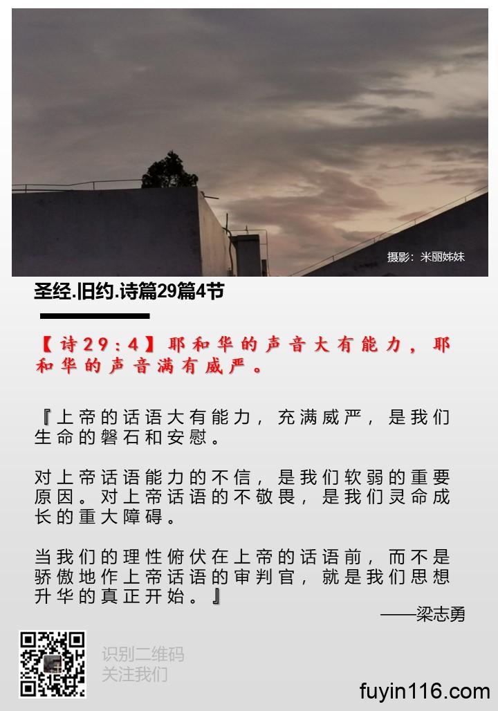 【诗29:4】耶和华的声音大有能力,耶和华的声音满有威严。 《我们该怎样对待“神的话语”?》 作者:梁志勇牧师 朗诵:徐辉姊妹 【诗29:4】耶和华的声音大有能力,耶和华的声音满有威严。 『上帝的话语大有能力,充满威严,是我们生命的磐石和安慰。 对上帝话语能力的不信,是我们软弱的重要原因。 对上帝话语的不敬畏,是我们灵命成长的重大障碍。 当我们的理性俯伏在上帝的话语前,而不是骄傲地作上帝话语的审判官,就是我们思想升华的真正开始。』 我们在天上的父,感谢赞美你 感谢你赐给我们《圣经》,让我们有活泼、永恒…
