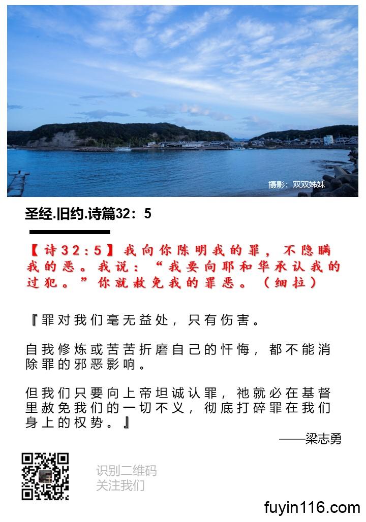 【诗32:5】我向你陈明我的罪,不隐瞒我的恶。我说:“我要向耶和华承认我的过犯。”你就赦免我的罪恶。(细拉) 《对我们危害最大的东西,是什么?我们该怎么办?》 作者:梁志勇牧师 朗诵:徐辉姊妹 【诗32:5】我向你陈明我的罪,不隐瞒我的恶。我说:“我要向耶和华承认我的过犯。”你就赦免我的罪恶。(细拉) 『罪对我们毫无益处,只有伤害。 自我修炼或苦苦折磨自己的忏悔,都不能消除罪的邪恶影响。 但我们只要向上帝坦诚认罪,祂就必在基督里赦免我们的一切不义,彻底打碎罪在我们身上的权势。』 我们在天上的父,感谢赞…