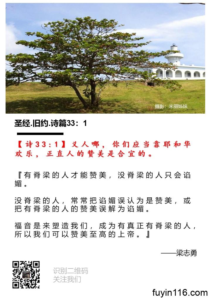 【诗33:1】义人哪,你们应当靠耶和华欢乐,正直人的赞美是合宜的。 《赞美不是谄媚,敬拜不是重担》 作者:梁志勇牧师 朗诵:徐辉姊妹 【诗33:1】义人哪,你们应当靠耶和华欢乐,正直人的赞美是合宜的。 『有脊梁的人才能赞美,没脊梁的人只会谄媚。 没脊梁的人,常常把谄媚误认为是赞美,或把有脊梁的人的赞美误解为谄媚。 福音是来塑造我们,成为有真正有脊梁的人,所以我们可以赞美至高的上帝。』 我们在天上的父,感谢赞美你 感谢你在我们还做罪人的时候,还是你的仇敌的时候,你就爱我们了。 而且你为了拯救我们这些抵挡…