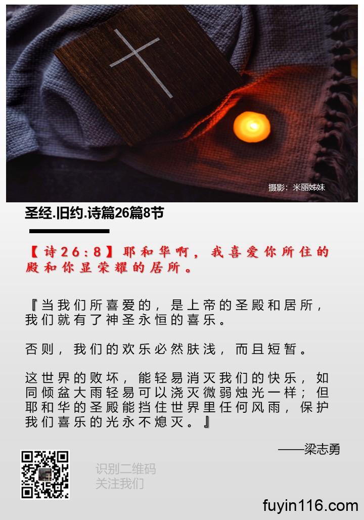 【诗26:8】耶和华啊,我喜爱你所住的殿和你显荣耀的居所。 《看,那不能熄灭的烛光》 作者:梁志勇牧师 朗诵:徐辉姊妹 【诗26:8】耶和华啊,我喜爱你所住的殿和你显荣耀的居所。 『当我们所喜爱的,是上帝的圣殿和居所,我们就有了神圣永恒的喜乐。 否则,我们的欢乐必然肤浅,而且短暂。 这世界的败坏,能轻易消灭我们的快乐,如同倾盆大雨轻易可以浇灭微弱烛光一样; 但耶和华的圣殿能挡住世界里任何风雨,保护我们喜乐的光永不熄灭。』 主耶稣基督,感谢赞美你 求你祝福我们每一位读者,让我们通过我们这短短的分享,认识…