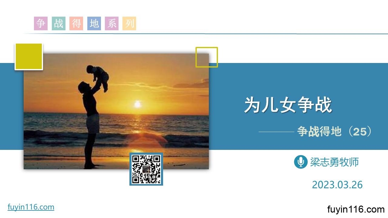 在3月26日,我们将继续《争战得地》系列的分享,第25讲: 《为儿女争战》 上帝赐给我们的儿女,有着极深的美意。 为什么我们要为儿女争战? 我们该怎样为儿女争战? 为儿女争战的父母,将会得到怎样的安慰和激励? 愿上帝的祝福借着祂的真道,更多地临到每一个认真聆听的灵魂。 欢迎您跟着我们的文章的提示,收听我们的录音: 《为儿女争战》 您也可以点击下面的链接,重温之前的信息: 《为家庭争战》 《争战得地》系列 点击音频媒体前面的小三角“►”就可以播放: 点击下面链接,观看讲道视频(因存储空间有限,zoom视…