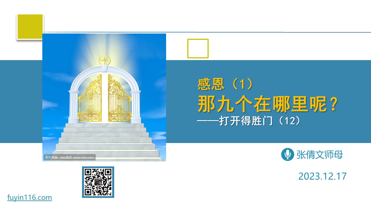 主耶稣曾经医好了十个大麻风病人,其中只有一人回来感恩。 这个故事,告诉我们“恩典的真理”是什么? 上帝赐给我们有哪两种恩典,两者的关系如何? 感恩的真义,到底是什么? 愿上帝的祝福借着祂的真道,更多地临到每一个认真聆听的灵魂。 欢迎您收听: 《那九个在哪里》 https://godmsg.me/ztxf 您也可以点击下面的链接,重温之前的信息: 《打开得胜门系列》 点击音频媒体前面的小三角“►”就可以播放 我们的阿爸天父,感谢…