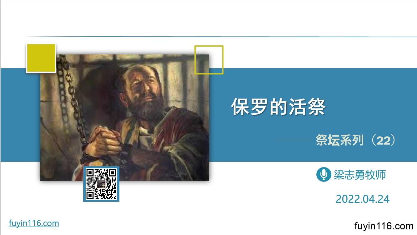 在4月24日,我们继续《祭坛系列》的尾声,这次我们要看一看新约里的一位重要人物——使徒保罗。 让我们一起寻求上帝的真理,去认识: 使徒保罗不仅对基督教影响深远,对整个世界都有巨大影响。 是什么,让保罗变成这样伟大的? 保罗做了那么多圣工,是什么支撑他的生命和服侍? 保罗对我们“献上活祭”的鼓励,给我们哪些重要的提醒?   点击音频媒体前面的小三角“►”就可以播放          我们的阿爸天父,感谢赞美你 感谢你赐给我们《圣经》真理,让我们认识“祭坛”与我们信仰的…