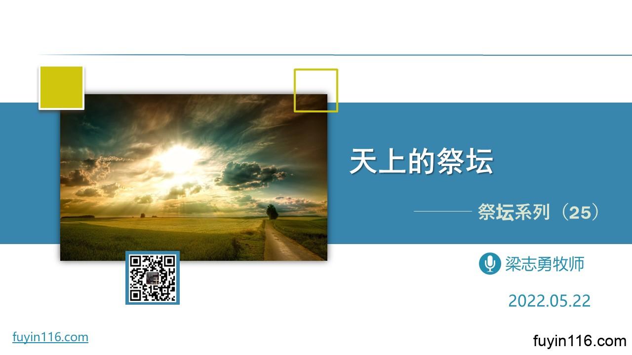 在5月22日,我们继续《祭坛系列》的尾声,我们这次要分享《天上的祭坛》。 我们知道,人类历史上的第一次献祭,是在伊甸园里,上帝杀了一只祭牲,为亚当夏娃做皮衣,代替他们的“无花果树叶裙”,并向他们宣告祂的救赎计划,以及对魔鬼及罪人的审判。 在圣经的最后一卷书《启示录》,我们会惊奇地发现,有关“祭坛”的信息依然是十分丰富的,有5处经文直接讲到祭坛。 所以,这次让我们聚焦“天上的祭坛”,看看: 上帝借着这些宝贵“天上的祭坛”的经文,向我们说了哪些重要的话? “天上的祭坛”和我们这些还生活在地上的圣徒,有什么关系? “天上…
