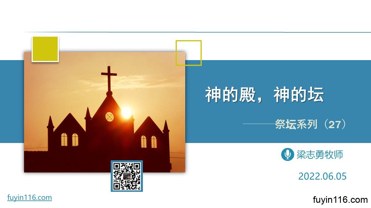 【启11:1】有一根苇子赐给我,当作量度的杖,且有话说:“起来,将 神的殿和祭坛,并在殿中礼拜的人都量一量。 【启11:2】只是殿外的院子要留下不用量,因为这是给了外邦人的,他们要践踏圣城四十二个月。 在6月5日,我们继续《祭坛系列》的尾声,“我们的祭坛”之二: 《神的殿,神的坛》。 在《启示录》第11章的这两节经文,让我们去认真思考: 神的殿,到底指的是什么? 神的殿和祭坛,又有什么关系? 神的殿,神的坛,与今天的我们,又有什么关系? 愿这些重要的真理,能在目前这纷繁艰难的境况里,帮助每一位认真聆听的读者,寻得神…
