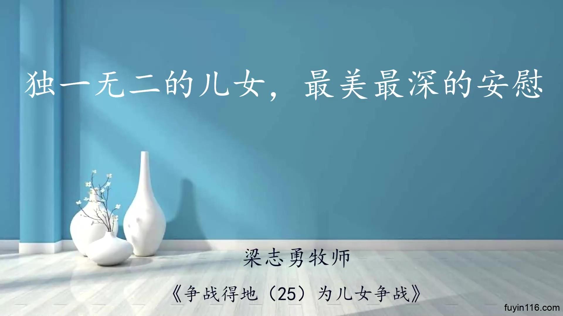 我们的每一个儿女, 都是上帝独一无二的创造。   让我们不再固执攀比, 反而欣赏儿女的独特性;   让我们竭力为他们争战, 儿女就必成为我们 最美、最深的安慰。 ——梁志勇《为儿女争战》 《争战得地(25)为儿女争战》   《福音布道》系列 《争战得地》系列 《福音观影会》系列 《旧约里的福音》系列 《祭坛系列》讲道 《因信称义》系列讲道(更新中) 《希伯来书》系列讲道(全) 《出埃及记》系列讲道(全) 《讲道信息》汇总 《梁牧清风》圣经默想 《五饼二鱼》讲道剪辑 &nb…