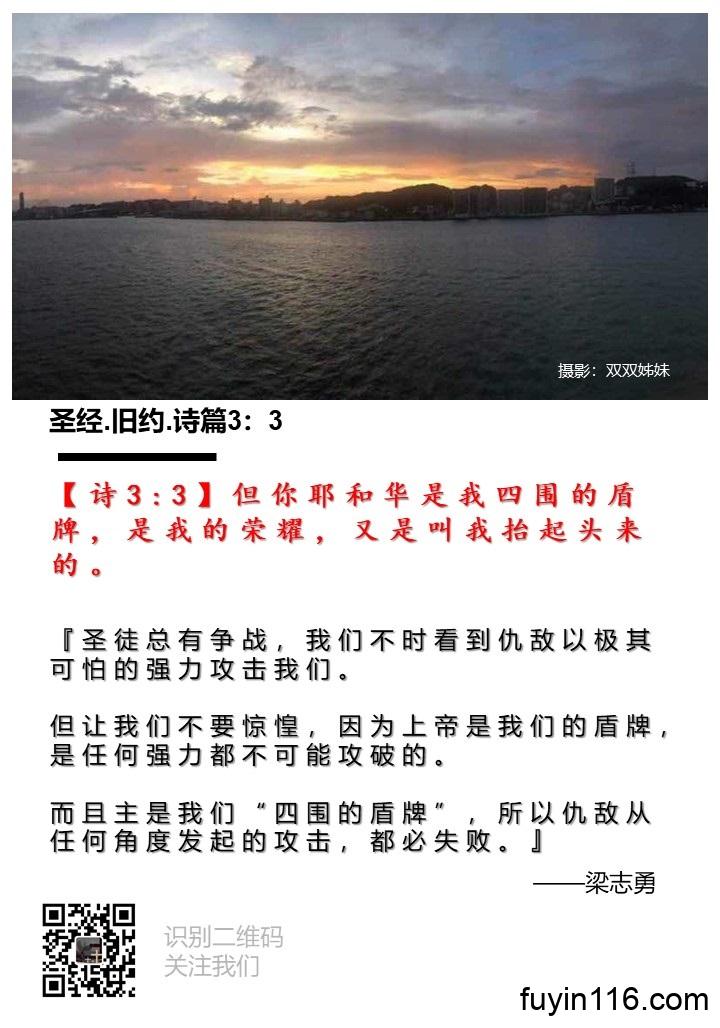 【诗3:3】但你耶和华是我四围的盾牌,是我的荣耀,又是叫我抬起头来的。 《四围的盾牌,是什么意思?》 作者:梁志勇牧师 朗读:徐辉姊妹 【诗3:3】但你耶和华是我四围的盾牌,是我的荣耀,又是叫我抬起头来的。 『圣徒总有争战,我们不时看到仇敌以极其可怕的强力攻击我们。 但让我们不要惊惶,因为上帝是我们的盾牌,是任何强力都不可能攻破的。 而且主是我们“四围的盾牌”,所以仇敌从任何角度发起的攻击,都必失败。』   亲爱的天父,我们感谢和赞美你, 你是我四围的盾牌,你是保护我的主。我要称颂你,我要赞美你。 你的保…