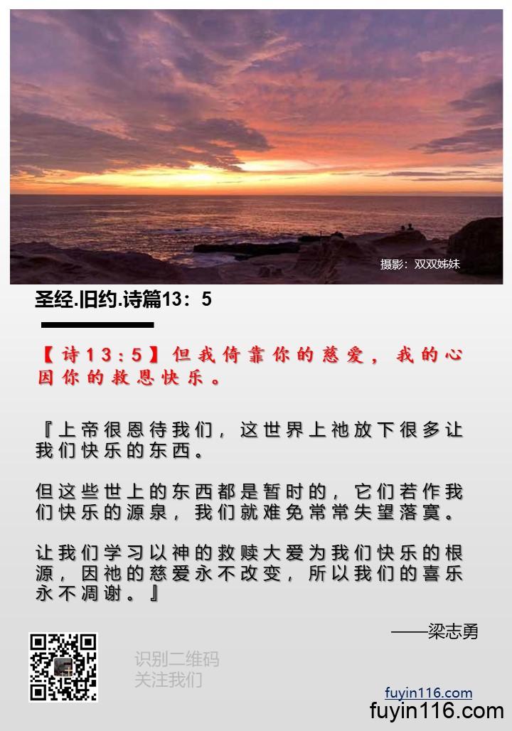 【诗13:5】但我倚靠你的慈爱,我的心因你的救恩快乐。” 《坏消息这么多,怎么喜乐得起来?》 作者:梁志勇牧师 朗诵:徐辉姊妹 【诗13:5】但我倚靠你的慈爱,我的心因你的救恩快乐。 『上帝很恩待我们,这世界上祂放下很多让我们快乐的东西。 但这些世上的东西都是暂时的,它们若作我们快乐的源泉,我们就难免常常失望落寞。 让我们学习以神的救赎大爱为我们快乐的根源,因祂的慈爱永不改变,所以我们的喜乐永不凋谢。』 爱我们的天父,我们感谢和赞美你 感谢你造了美好的万物,并把我们安放其间,让我们可以享受你的美善。 是的,你告诉我…