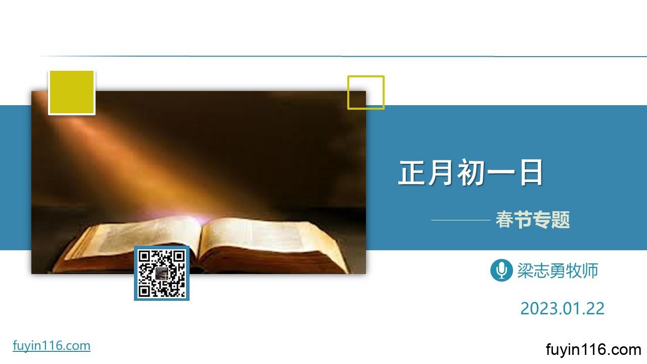 1月22日的主日,恰逢中国农历新年的“正月初一”,所以我们做一次特别的分享: 《正月初一日》 《圣经》中有哪些“正月初一日”发生的重大事情? 这些“正月初一”里蕴含着哪些宝贵的真理? 这些“正月初一”,对今天的我们有何启迪? 欢迎您跟着我们的文章的提示,收听我们的录音和录像: 《正月初一日》 愿上帝的祝福借着祂的真道,更多地临到每一个认真聆听的灵魂。 您也可以点击下面的链接,重温之前的信息: 《争战得地》系列 《新天新地、新圣城》 《圣诞专题:平安何处来?》 点击音频媒体前面的小三角“►…
